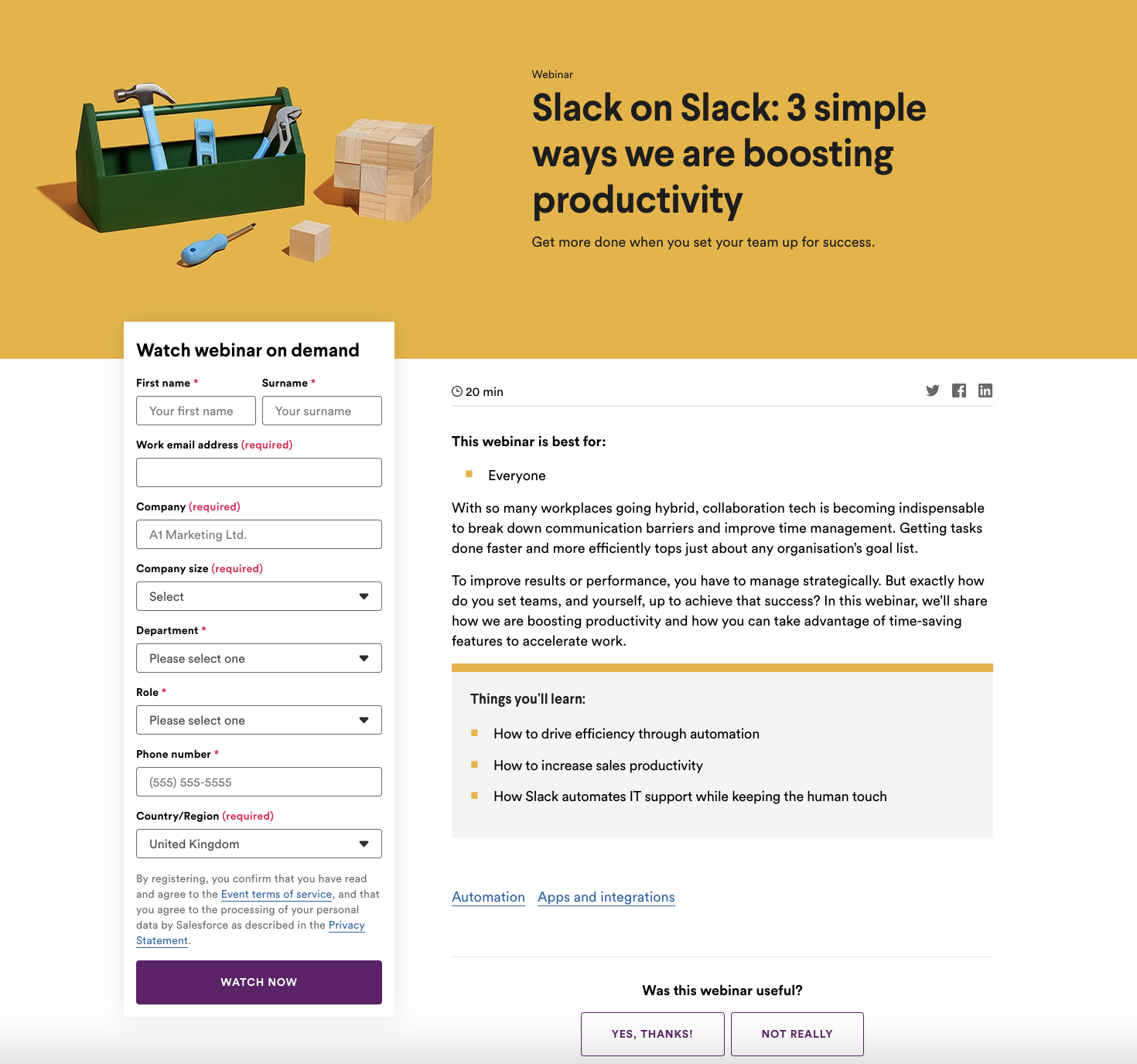 Slack organizes webinars to help users optimize their use of the platform and unveil new features. Its webinar pages are structured for quick user registration, featuring modern designs that stand out with clean, memorable visuals. The content on these pages is concise, clearly stating the webinar’s target audience, duration, and benefits, ensuring efficient communication of the essential details. This approach makes Slack’s landing pages highly effective in engaging and converting visitors.